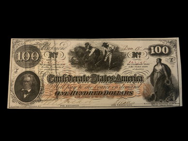 “Slave Cartouche” 1862 $100 Note. Mint Condition has three stamps. RARE Asst. Treasurers Stamp from Jackson MS. RARE “C.S.” Stamp and a Macon 1864 Stamp.