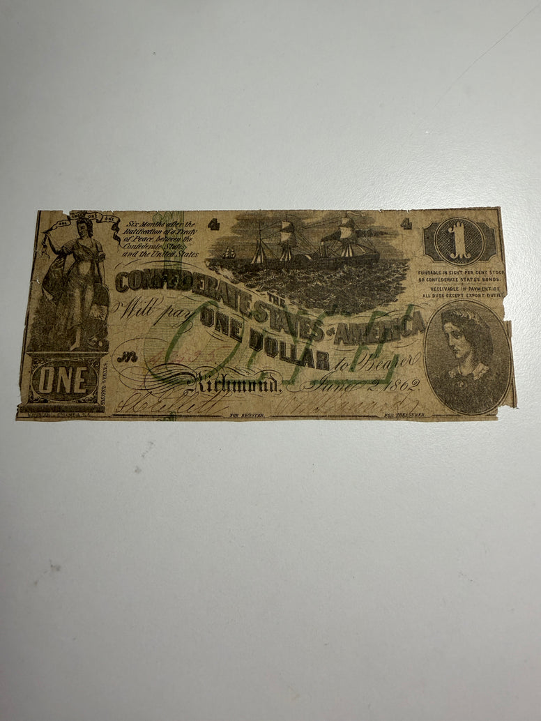 This is a rare variety of the 1862 $1 note with the green “ONE” printed on the face of the note. Any kind of color printing on notes before the 1864 issue are always more rare and command more money most of the time.