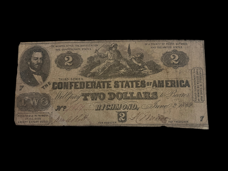 This 1862 $2 CSA note is in what we believe to be Fine condition. It has not major tears or missing pieces and it’s intact with some wear to the overall color and shade of the ink.